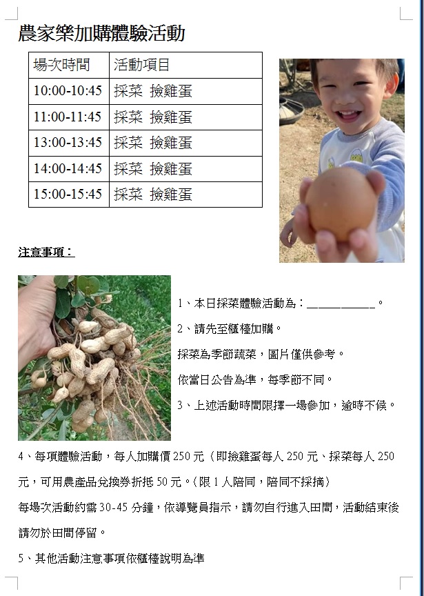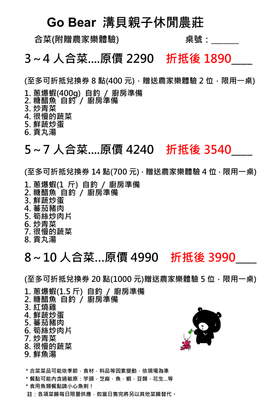 *每日合菜贈送體驗活動(例:釣魚/抓蝦/撿雞蛋/拔蘿蔔等)依現場公告為準