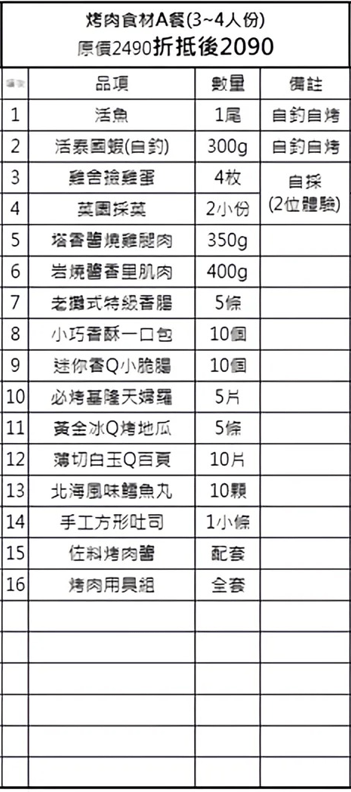烤肉相關 全新推出!火烤兩吃烤肉來囉~ 烤肉食材請先預訂, 請撥 0981643468/ 0906585969 超有趣的烤肉活動,自己吃的生菜自己採,自己吃的魚蝦自己釣喔~ *自備食材自不提供! *活動請依現場櫃檯說明為準。 共享此文章: 分享到 X(在新視窗中開啟) X 分享到 Facebook(在新視窗中開啟) Facebook 喜歡 正在載入...